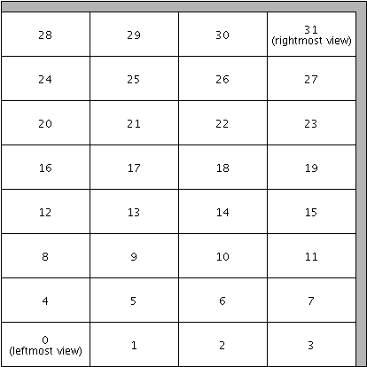 A quilt is an array of 2D images, where the bottom left is the left-most image, and the top-right is the right-most image.